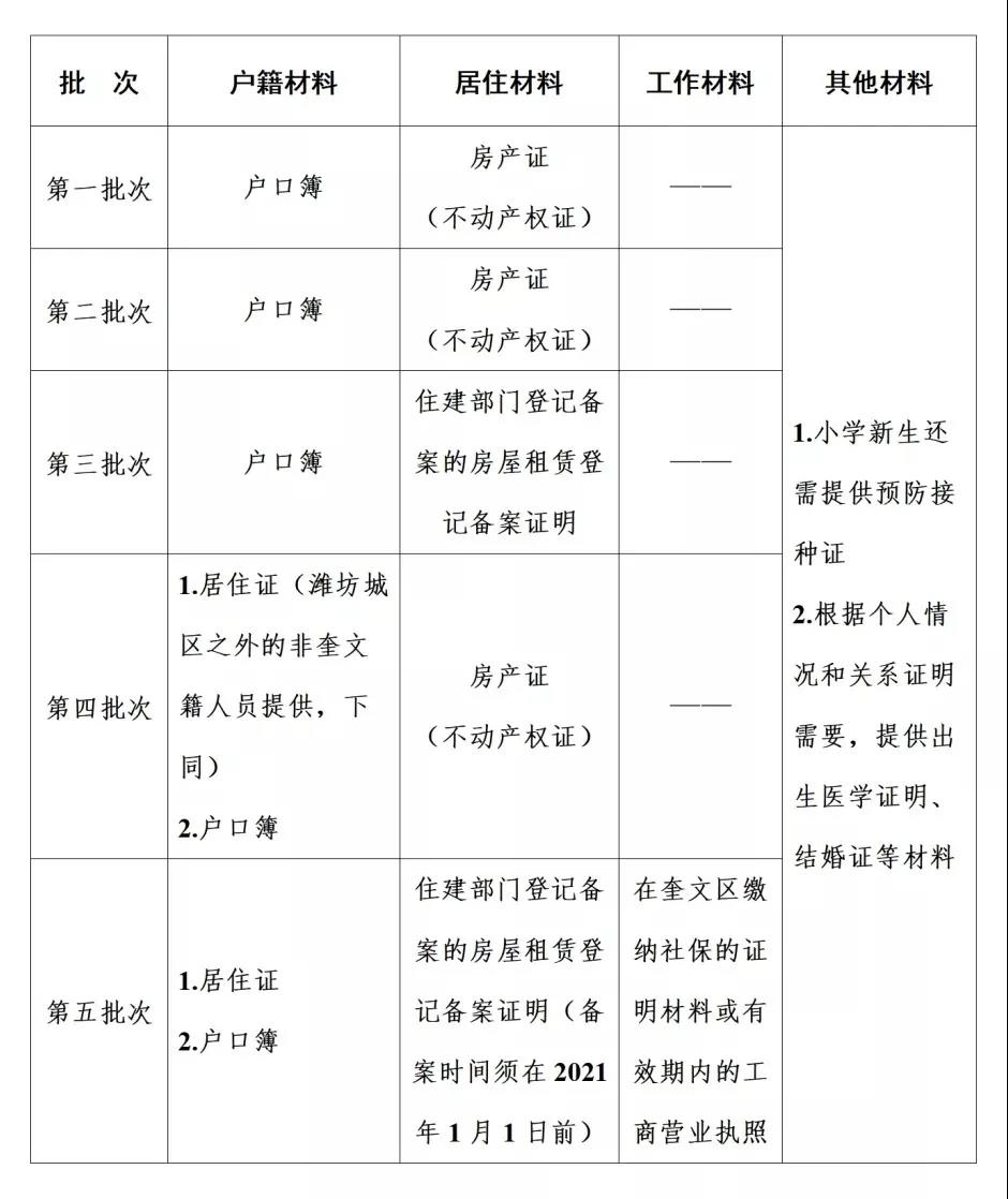 第五批次:非奎文户籍新生,新生及监护人在潍坊市城区无房产,在招生片区内连续单独承租居住(2021年1月1日前备案),监护人至少一方在奎文区合法稳定就业。