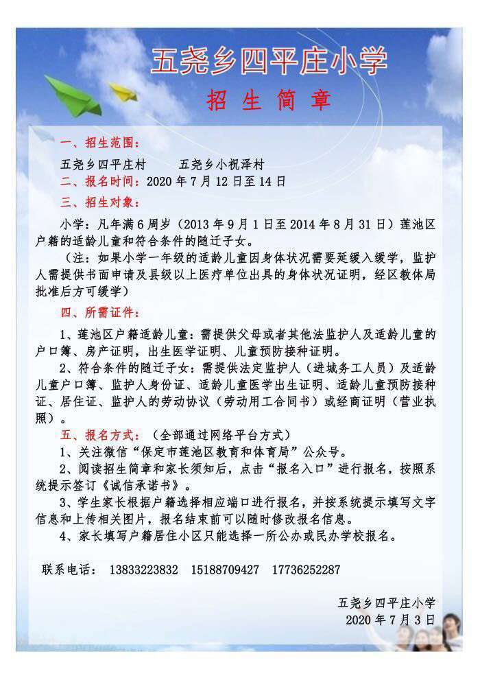 保定市莲池区五尧乡四平庄小学招生简章及招生咨询电话
