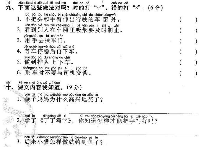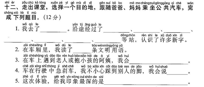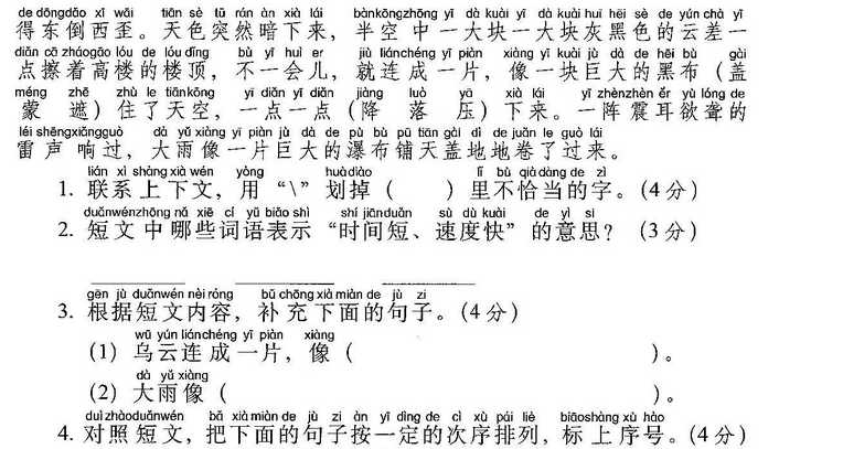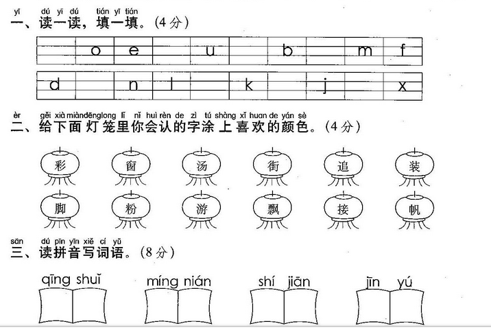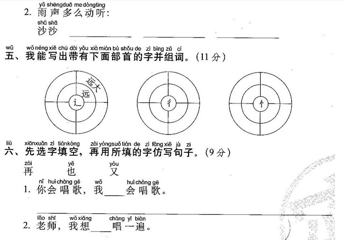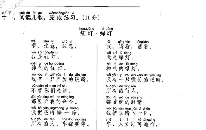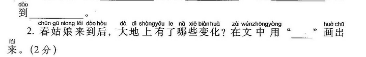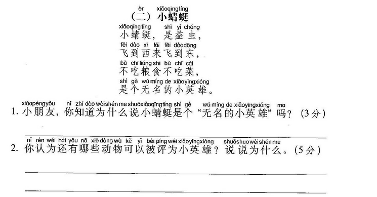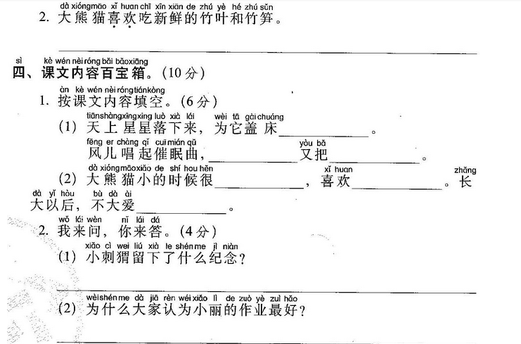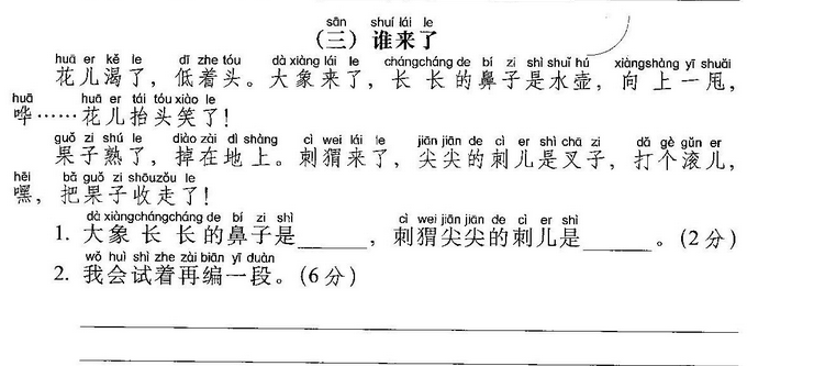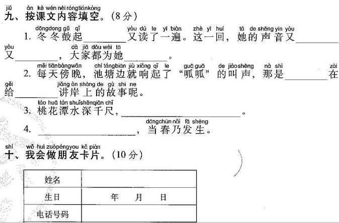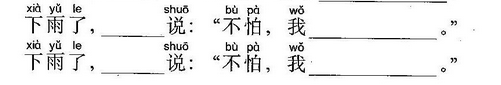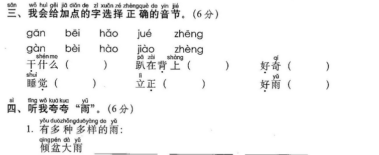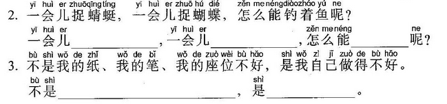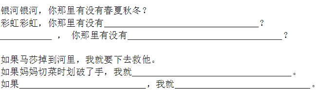 小鱼(玩)了一天水,池塘妈妈(怀)(里)睡。 天上(星)(星)(落)下来,为它盖床珍珠被。 (风)儿(唱)起催眠(曲),波浪又(把)摇篮 推。小鱼(做)了个甜甜的(梦),摆摆(尾) (巴)咂咂嘴。