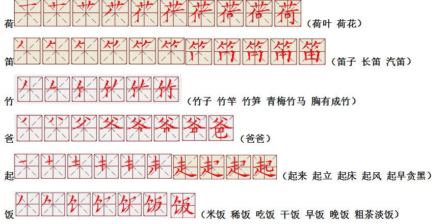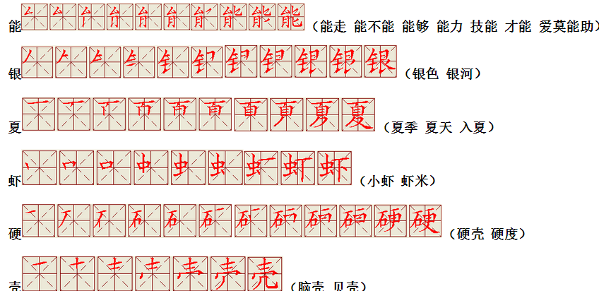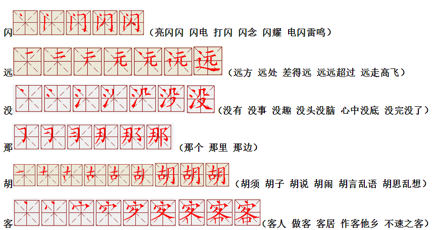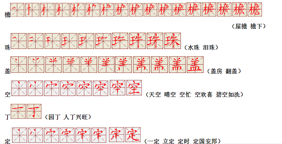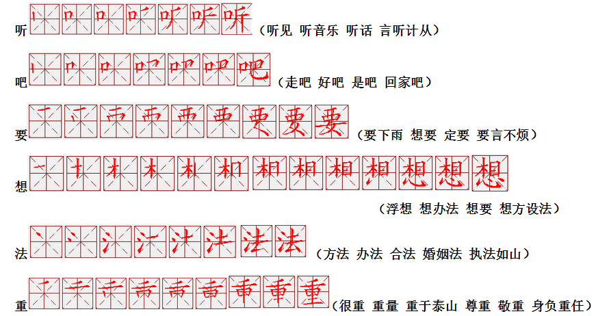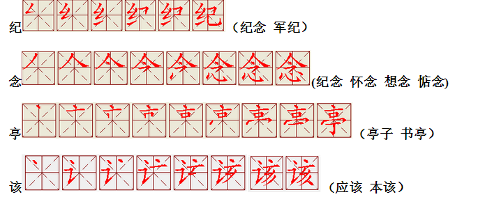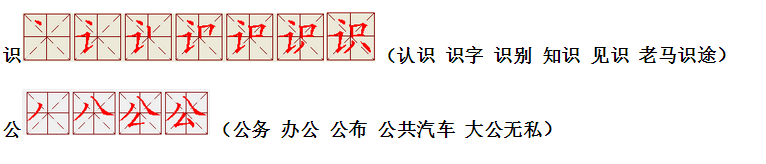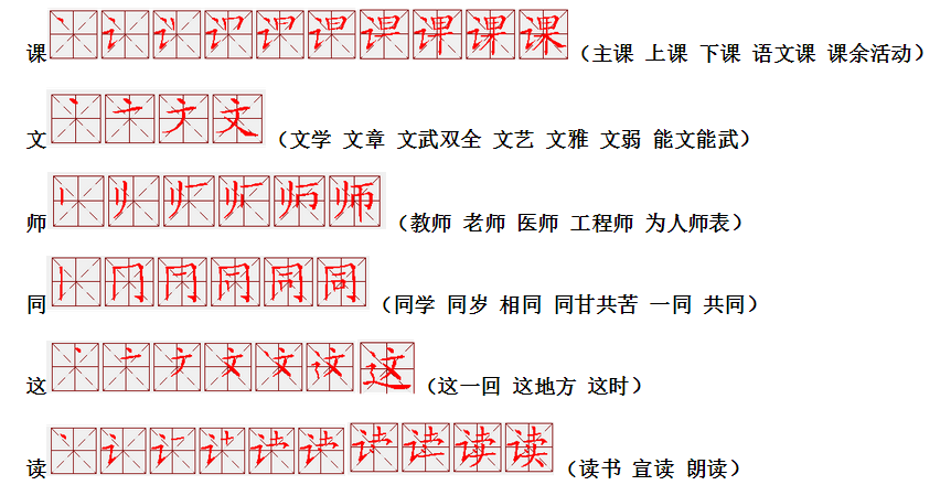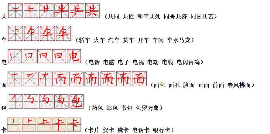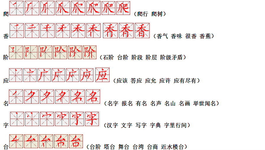 词语:应该 应当 应用 名片 姓名 名声 名字 认字 写字 讲台 台灯 台阶 石阶 车站 站立 站台 六亲不认 六神无主 五颜六色 纪念 记住