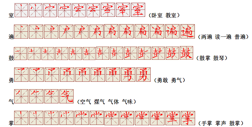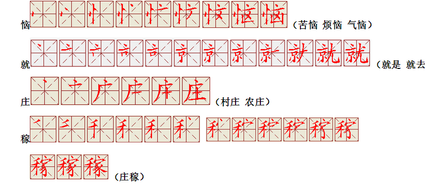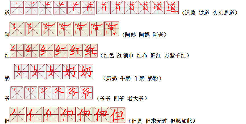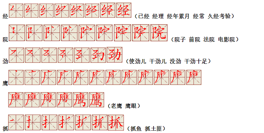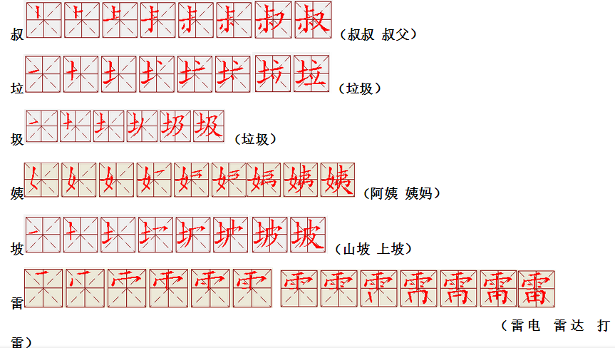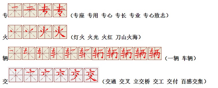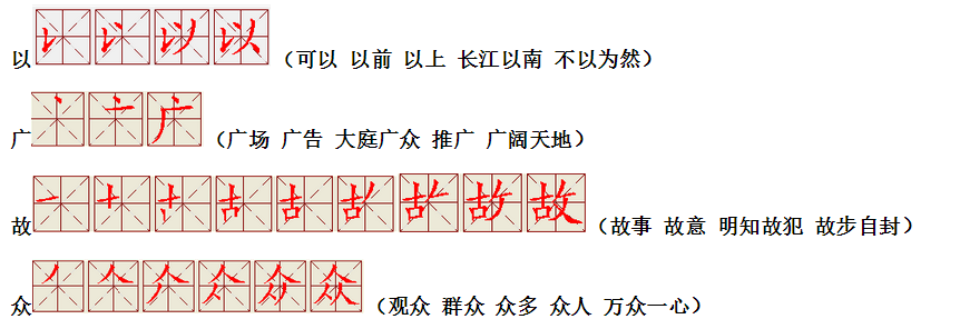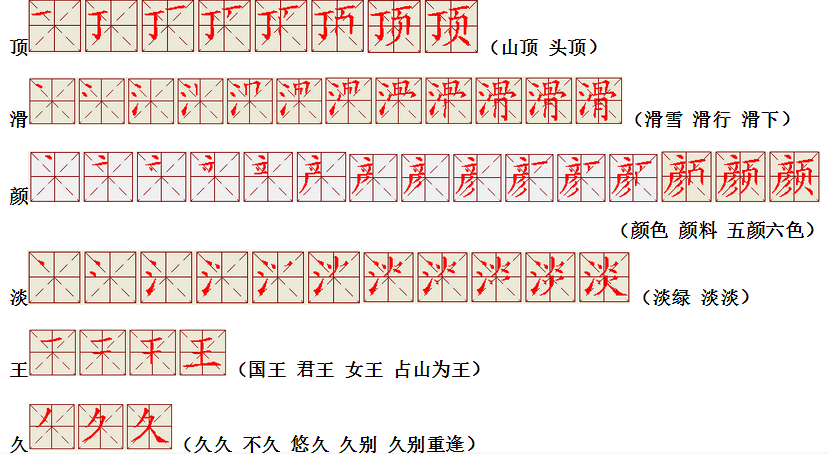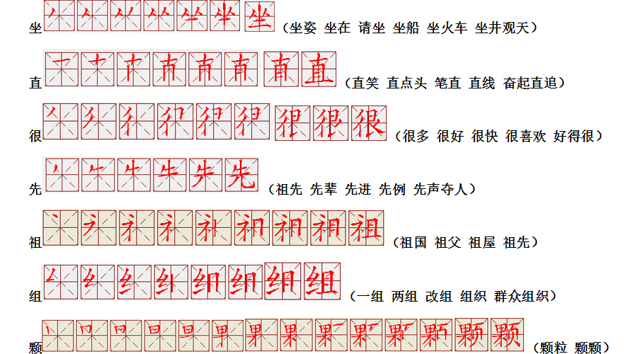 词语:应该 应当 应用 名片 姓名 名声 名字 认字 写字 讲台 台灯 台阶 石阶 车站 站立 站台 六亲不认 六神无主 五颜六色 纪念 记住