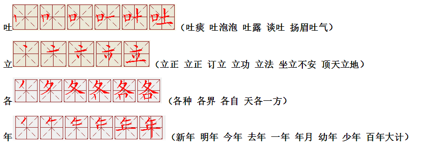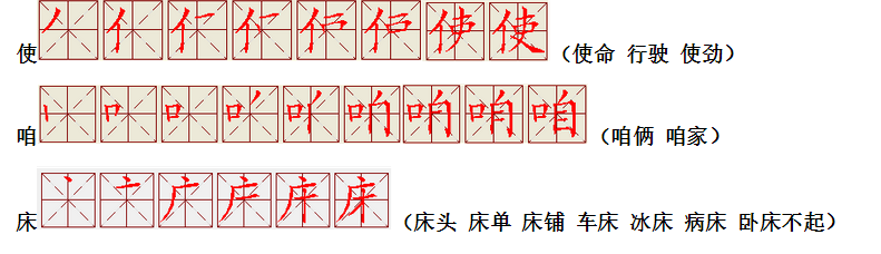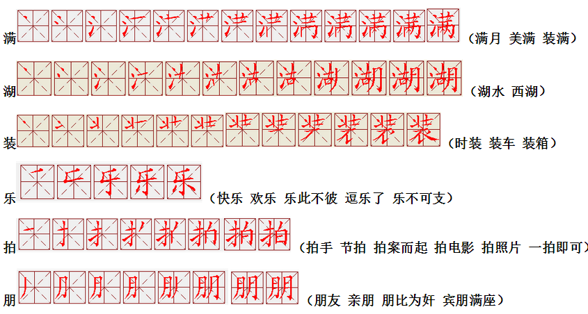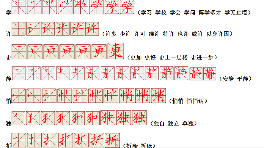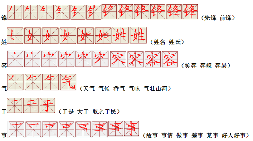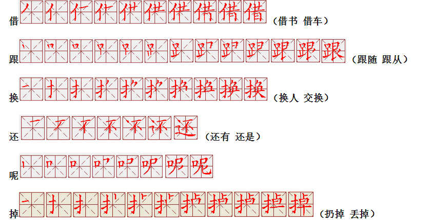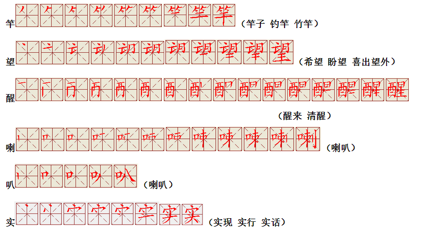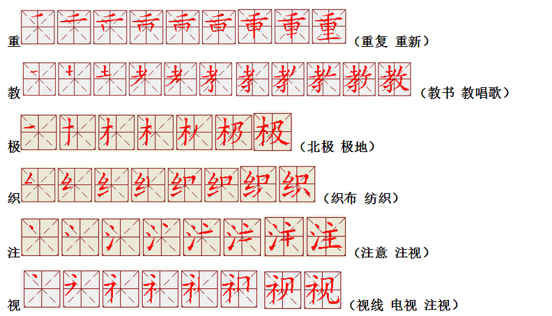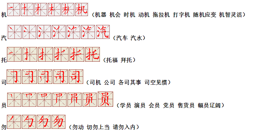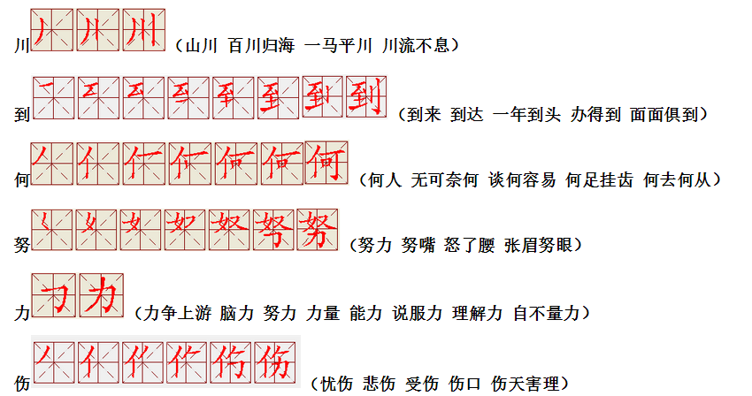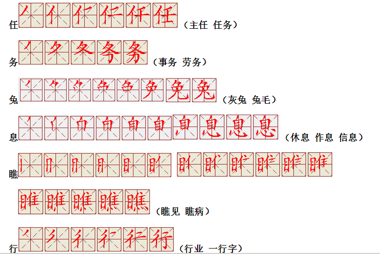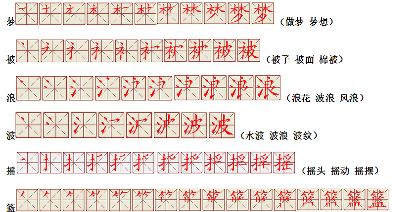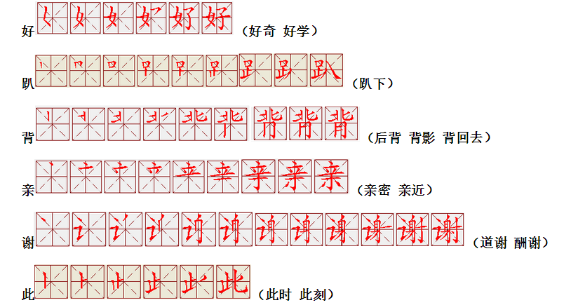 词语:写字 书写 写作 友好 问好 美好 对话 对方 对手 拿手好戏 拿手 拿主意 毛笔 笔直 笔尖 丢开 丢失 丢三落四 身体 身材 身份