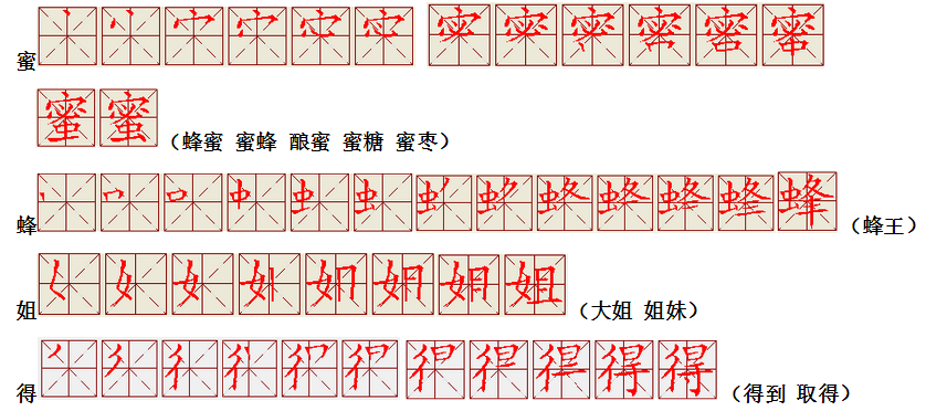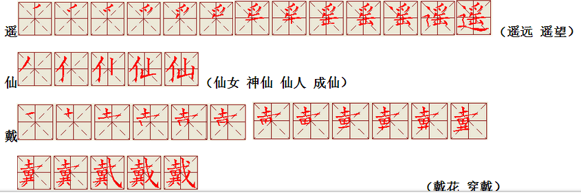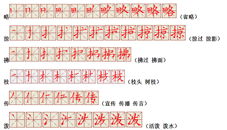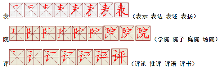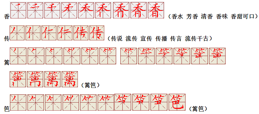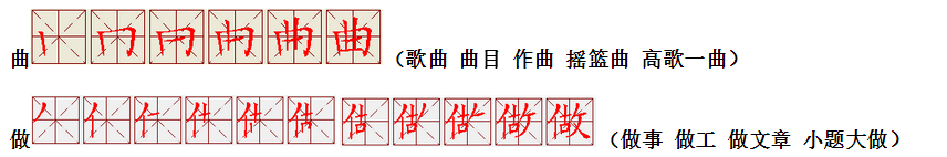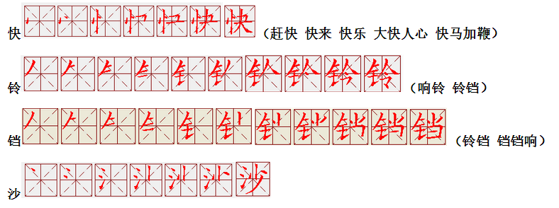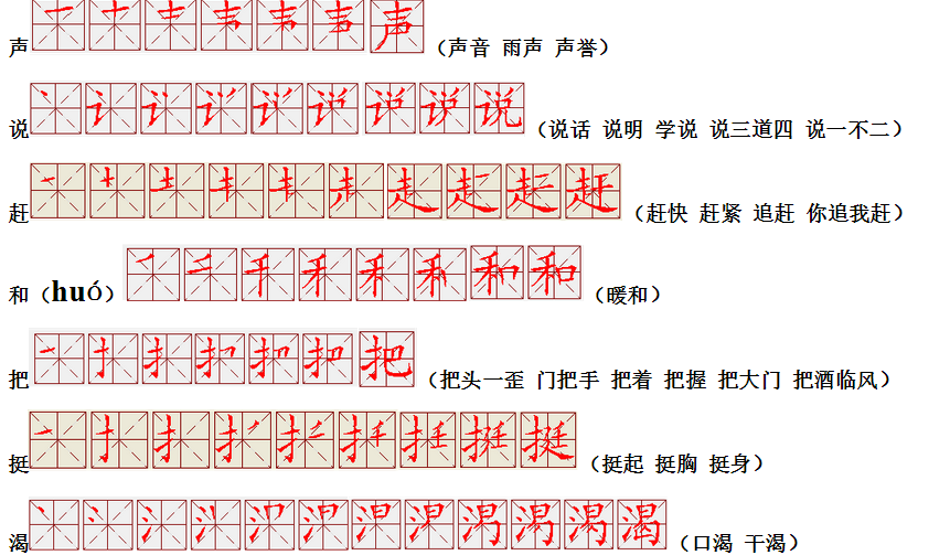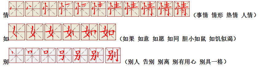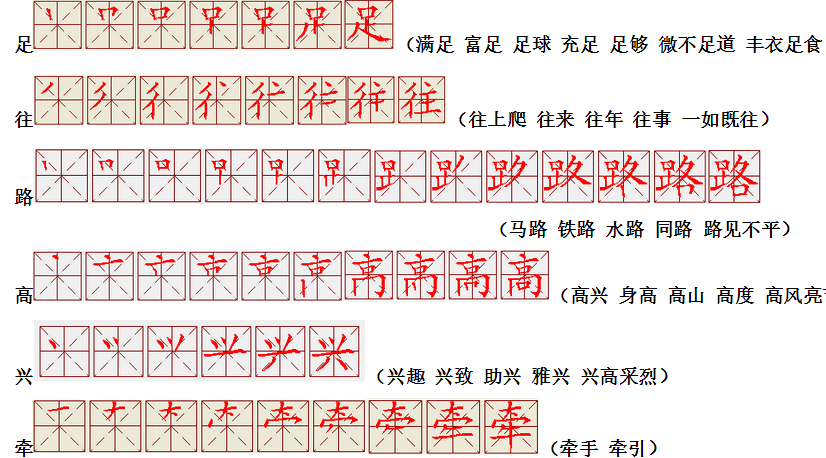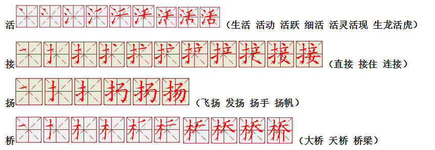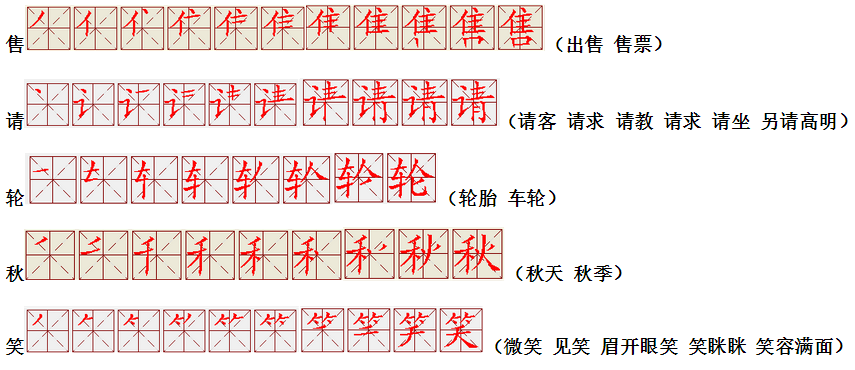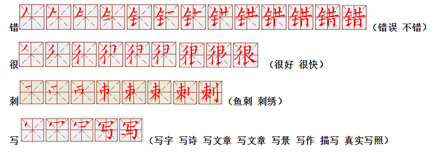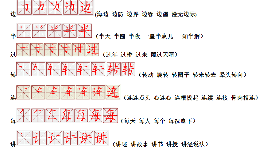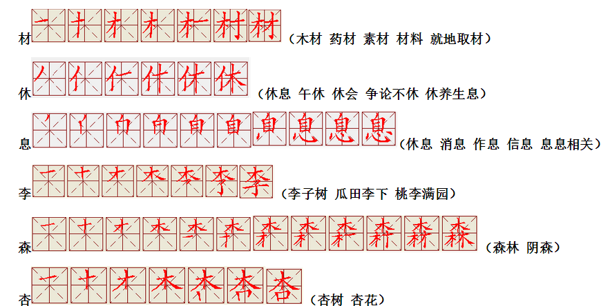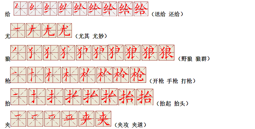 词语:写字 书写 写作 友好 问好 美好 对话 对方 对手 拿手好戏 拿手 拿主意 毛笔 笔直 笔尖 丢开 丢失 丢三落四 身体 身材 身份