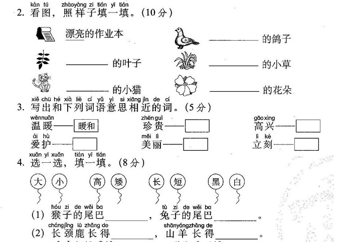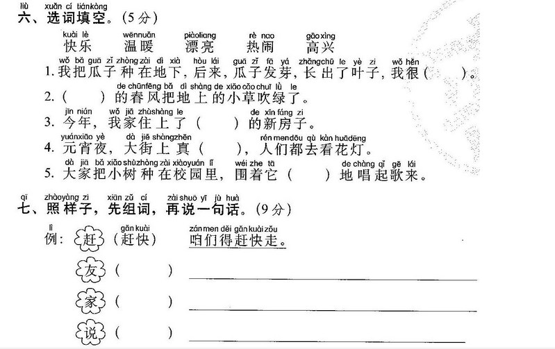 温暖的(阳光) 温暖的( 手 ) 温暖的( 家 ) 快乐的(节日) 快乐的(小朋友)