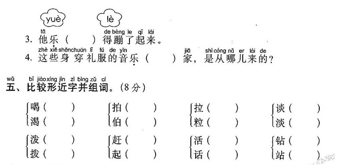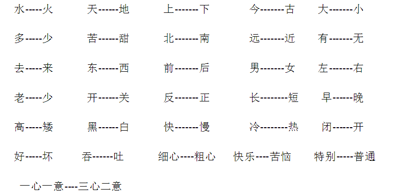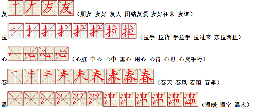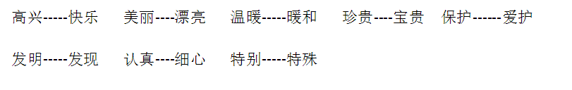 词语:快乐 欢乐 拍手 节拍 朋友 友情 友谊 拉手 拉住 拉车 拉门 开心 用心 三心二意 一心一意
