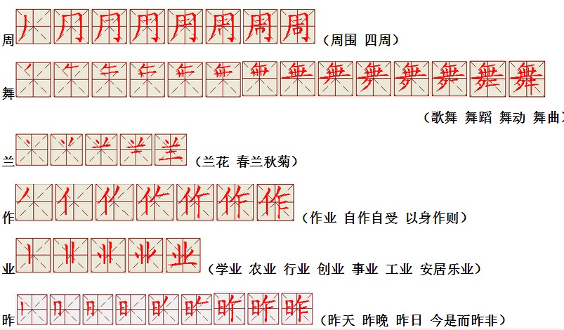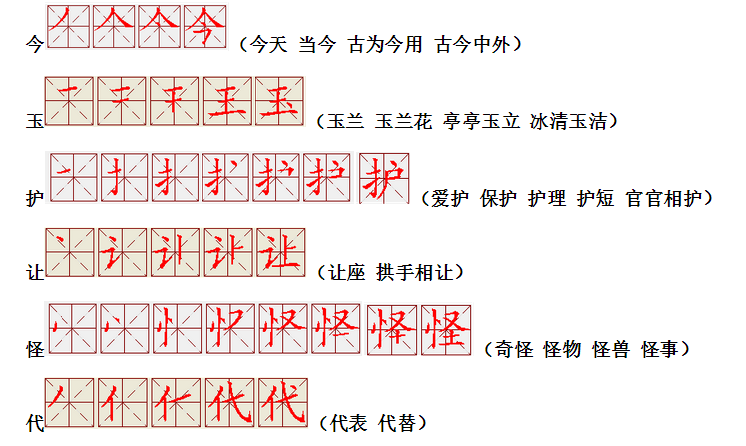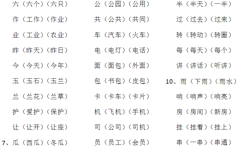 词语:作业 工作 作为 作用 农业 业主 昨天 昨日 昨晚 今天 当今 玉石 玉米 美玉 玉兰 兰花 护士 保护 爱护 让开 让路 让座