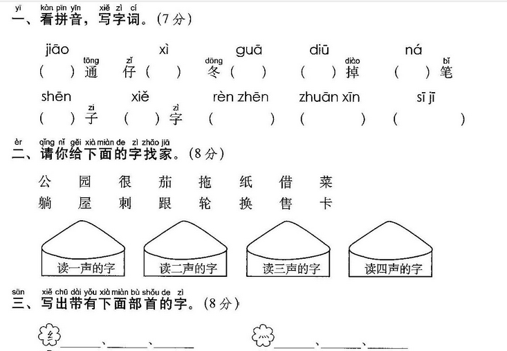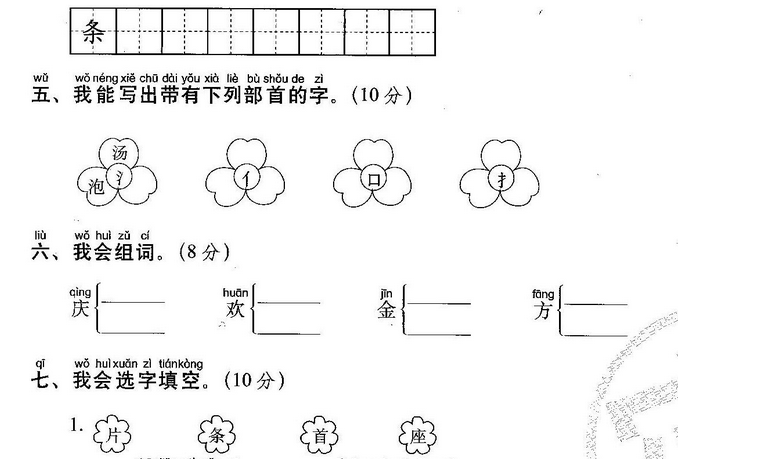 词语:家乡 故乡 老乡 布条 金条 条件 河水 河流 清 水 清早 清波 清风 青色 青山 名片 卡片 只言片 语 片面 首先 首领 首要 回首 生活 干活 活力
