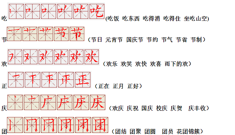 词语:节日 节目 春节 过节 欢乐 欢快 欢心 吃饭 小吃 吃力 正月十五 正月 正好 正在 立正 欢庆 庆幸 庆祝 团圆 团结