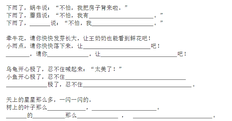 小鱼(玩)了一天水,池塘妈妈(怀)(里)睡。天上(星)(星)(落)下来,为它盖床珍珠被。(风)儿(唱)起催眠曲),波浪又(把)摇篮推。小鱼(做)了个甜甜的(梦),摆摆(尾)(巴)咂咂嘴。
