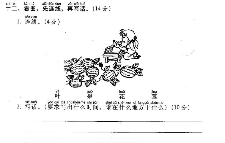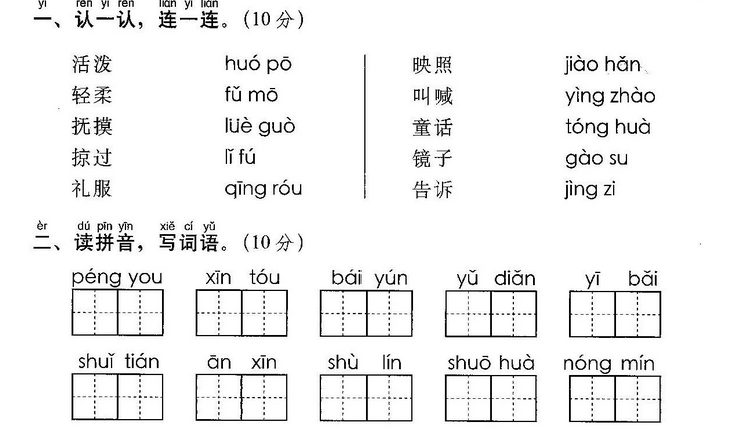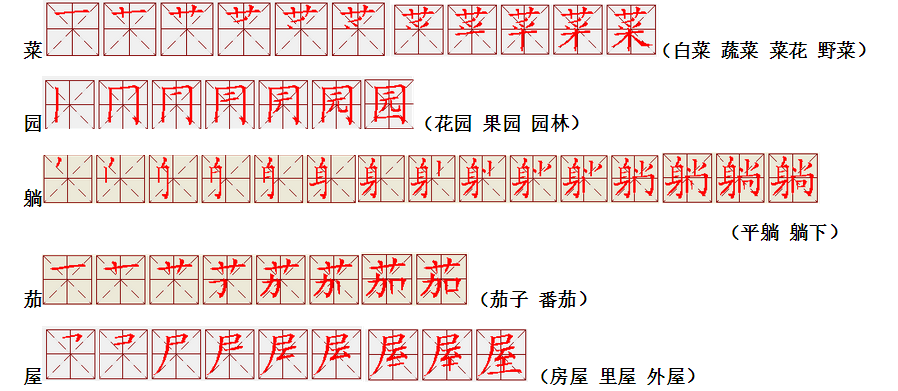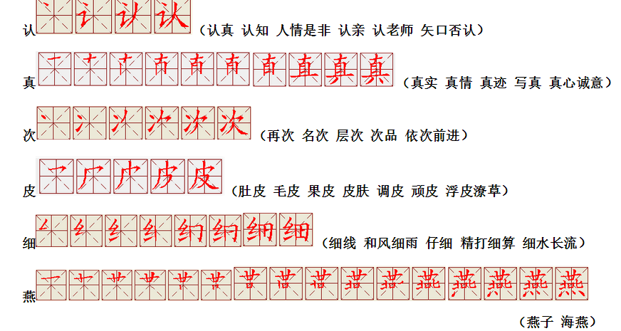 词语:西瓜 苦瓜 冬瓜 认识 认可 认为 认错 认真 真正 真实 次要 次数 皮毛 树皮 细心 仔细 细节 细水 长流