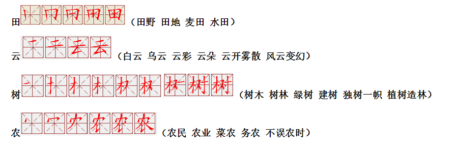 词语:田地 种田 映照 反映 云朵 白云 云彩 乌云 树叶 树苗 树木 大树 农村 农业 农夫 人民 农民 民族
