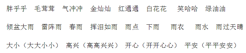 词语:米粒 饭粒 种子 品种 雨点 点心 早点 声音 音乐 回音 音节 说话 说明 小说 赶快 赶走 赶路