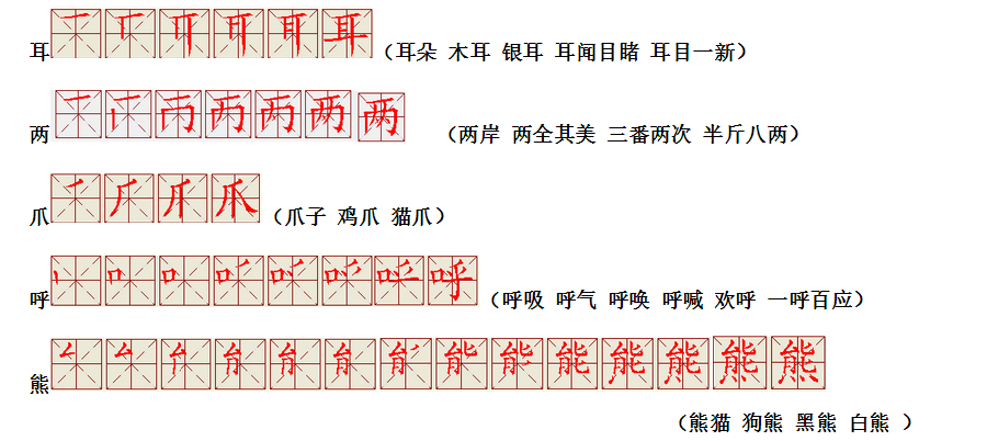 词语:在乎 几乎 胖乎乎 似乎 四处 四季 四面八方 黑色 黑暗 木耳 耳朵I耳聪目明 两面 两全其美 斤两 爪 子 利爪 呼叫 欢呼 呼吸