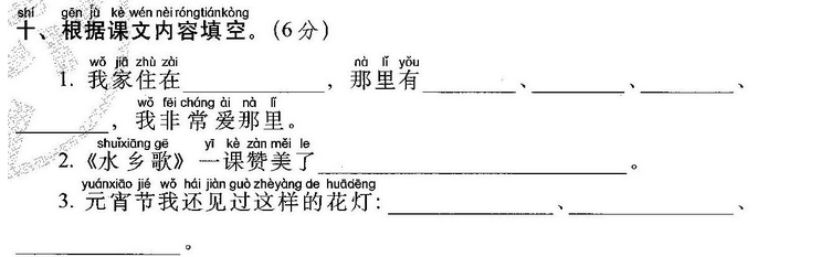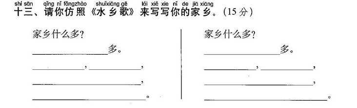 1) 水(乡)(什)(么)(多)?水多。千 (条)渠,(万)(条)(河),(河)塘一个接一(处)(处)(绿)(水)扬(清)(波)。