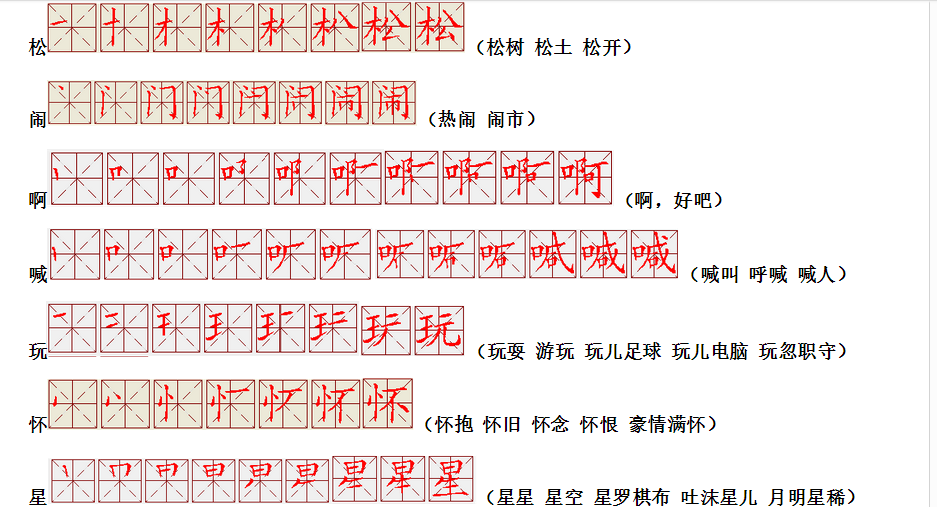 词语:玩耍 怀抱 关怀 怀念 星星 星空 明星 乐曲 歌曲