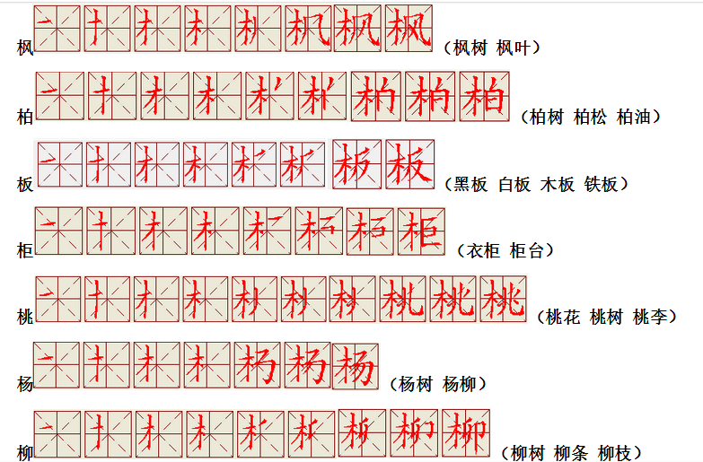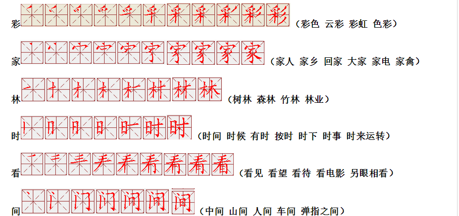 词语:回家 家乡 家家户户 树林 森林 园林 时间 时光 时代 看见 看书 观看 中间 午间 山间 方位 方向 地方 方方正正 远方 青色 青山