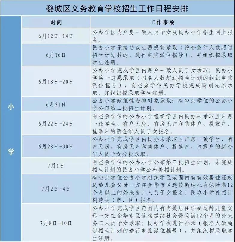 ⑤无房无户。适龄儿童、少年及父母(法定监护人)持有金华市公安机关签发的《浙江省居住证》或父母一方参加本市区职工社会保险满12个月(因疫情防控需要允许补缴的除外)的。