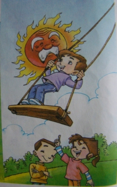 我和小刚先荡,轮到丁丁荡的时候,我和小刚在旁边观看。只见丁丁两脚用力一蹬,一下子就荡到上了天。太阳公公说:“小朋友,你太棒啦!你都快荡到我这么高了。”