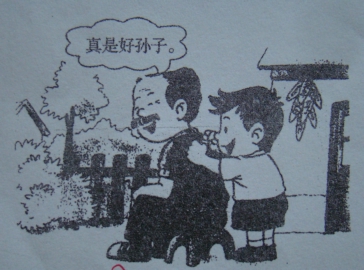 明明搬来一张小板凳,爷爷坐下了,明明轻轻地锤着爷爷的背,爷爷说:“小明真是爷爷的乖孙子!