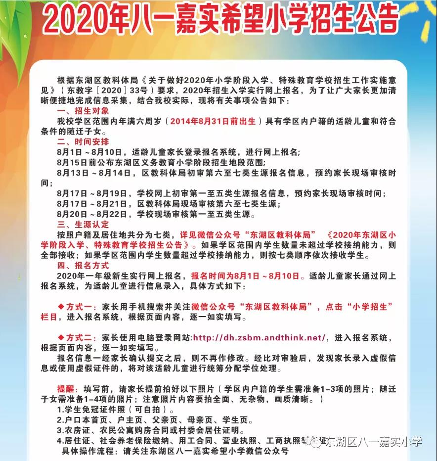 南昌市八一嘉实希望小学2020年招生公告