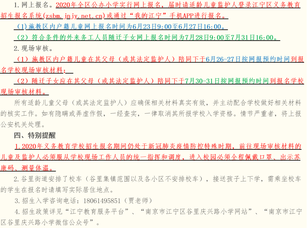 南京市江宁区谷里庆兴路小学2020年一年级招生简章