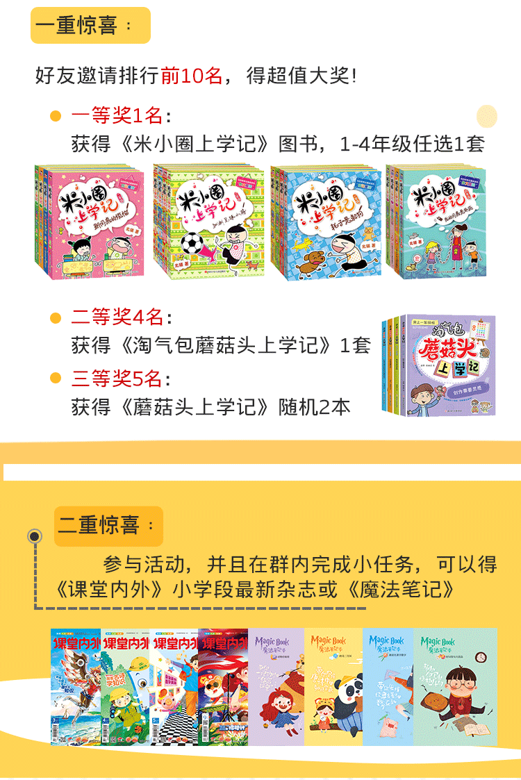 活动奖品 报名参加本次活动,还有双重惊喜大奖! ➤奖品一:好友助力排行前10名,得丰厚大礼 ●一等奖1名:获得《米小圈上学记》图书,1-4年级任选一套 ●二等奖4名:获得《淘气包蘑菇头上学记》1套 ●三等奖5名:获得《蘑菇头上学记》随机2本 ➤奖品二:报名成功后在活动群参与小任务,可获得《课堂内外》小学段最新杂志或《魔法笔记本》 如何报名