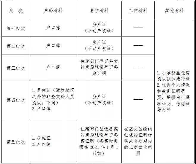 第五批次:非奎文户籍新生,新生及监护人在潍坊市城区无房产,在招生片区内连续单独承租居住(2021年1月1日前备案),监护人至少一方在奎文区合法稳定就业。