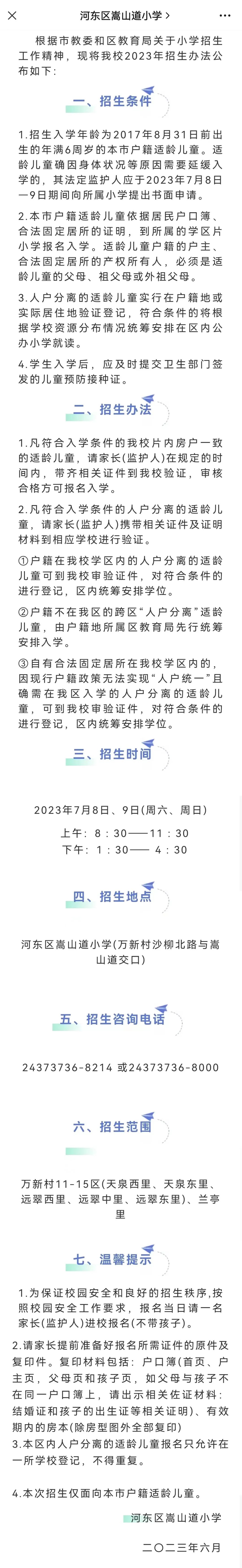 2023年天津市河东区嵩山道小学招生简章,含招生咨询电话