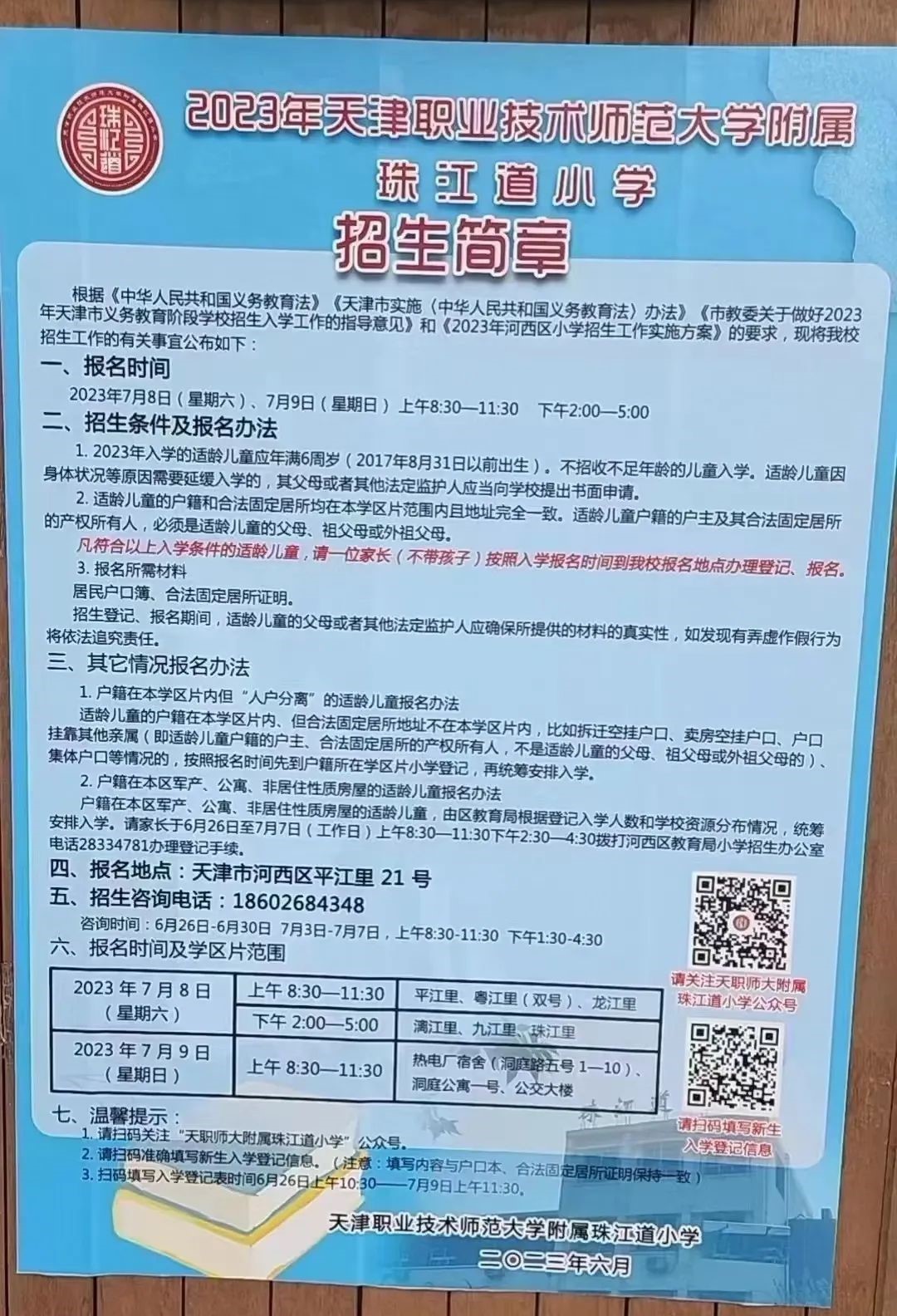 2023年天津市河西区天津职业技术师范大学附属珠江道小学招生简章,含招生咨询电话