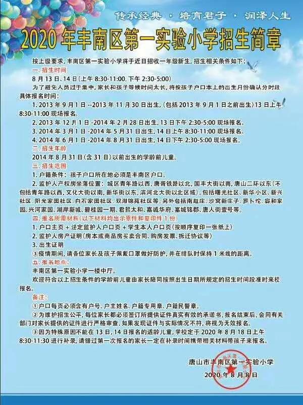 2020年唐山市丰南区第一实验小学招生简章