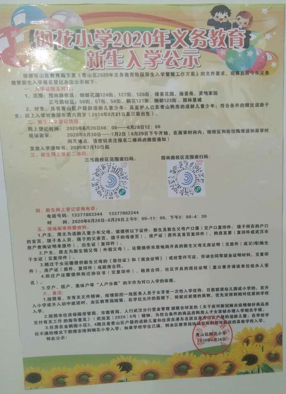 2020年武汉市钢花小学新生入学招生公告