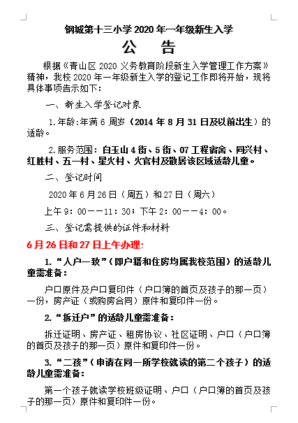 2020年武汉市青山区钢城第十三小学(钢城十三小)新生入学招生公告