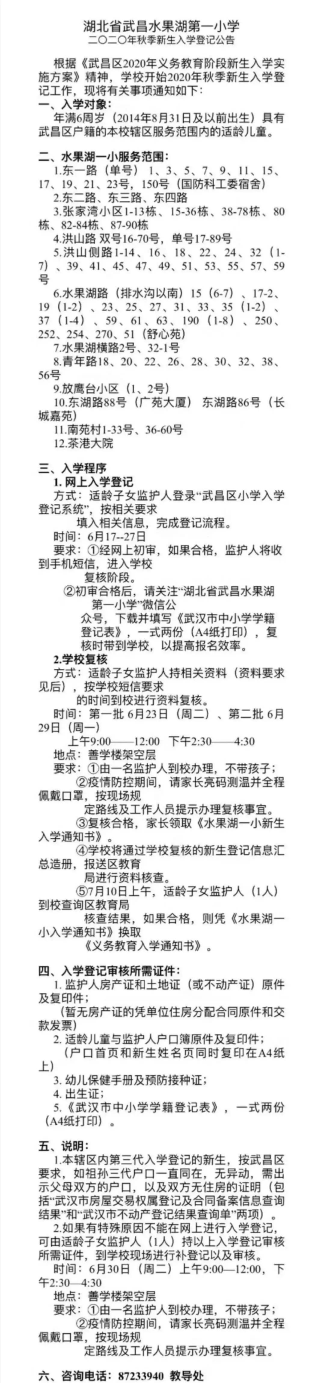 武汉市水果湖第一小学2020年新生入学招生公告以及招生咨询电话