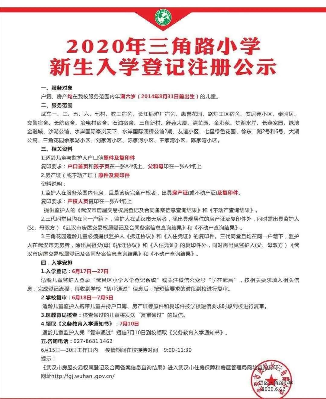 武汉市三角路小学2020年新生入学招生公告以及招生咨询电话