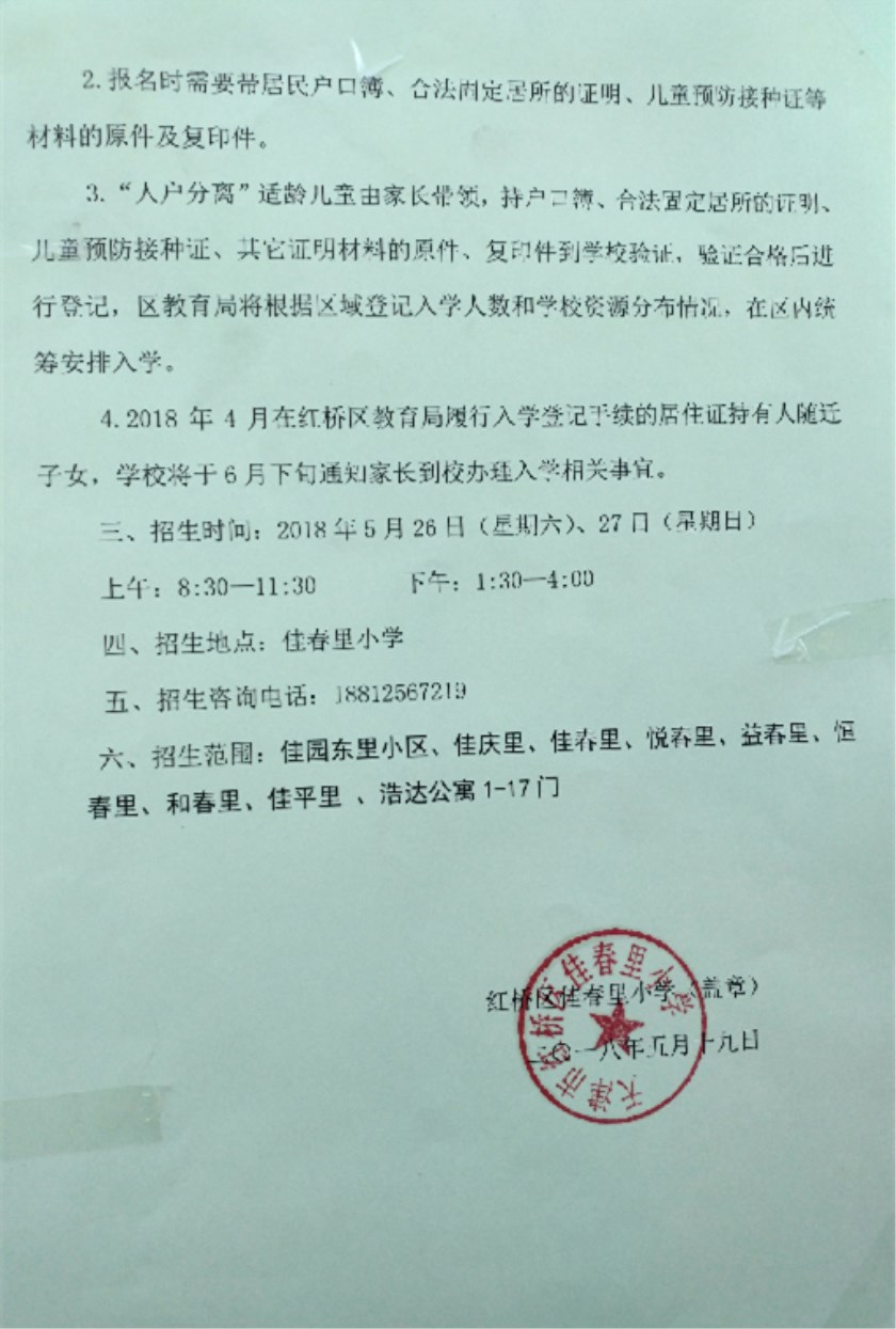 天津市红桥区佳宁里小学最新招生简章及划片信息: