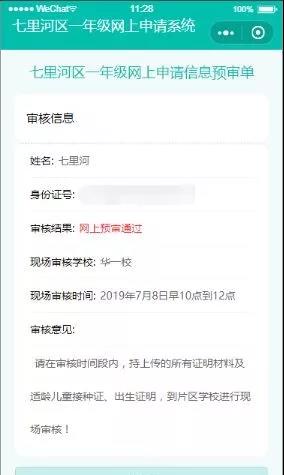 (16)注:在学校未审核之前,您可以再次登录系统进行错误数据修改提交。在学校初审结束后,您可以登录系统查看审核结果。若初审未通过,您可以根据审核意见进行相关操作。若初审通过,请持预审单和相关证明材料,根据自主选择的审核时间段到片区学校进行现场审核。如下图16所示: