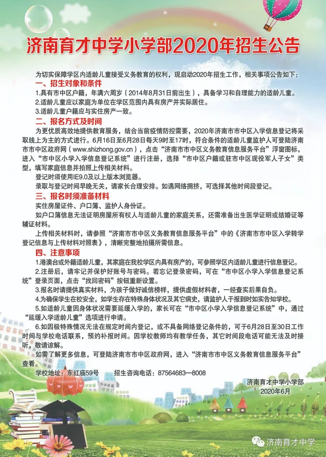 济南育才中学小学部2020年招生公告及招生咨询电话