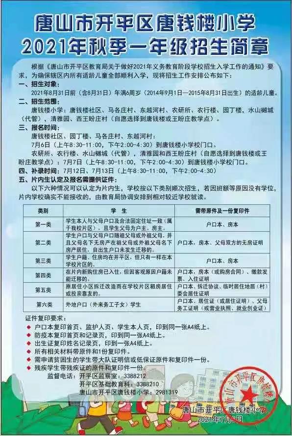 唐山市开平区唐钱楼小学2021年一年级招生简章,含招生咨询电话