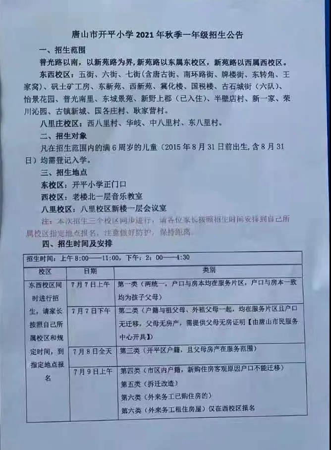 唐山市开平区开平小学2021年一年级招生简章,含招生咨询电话