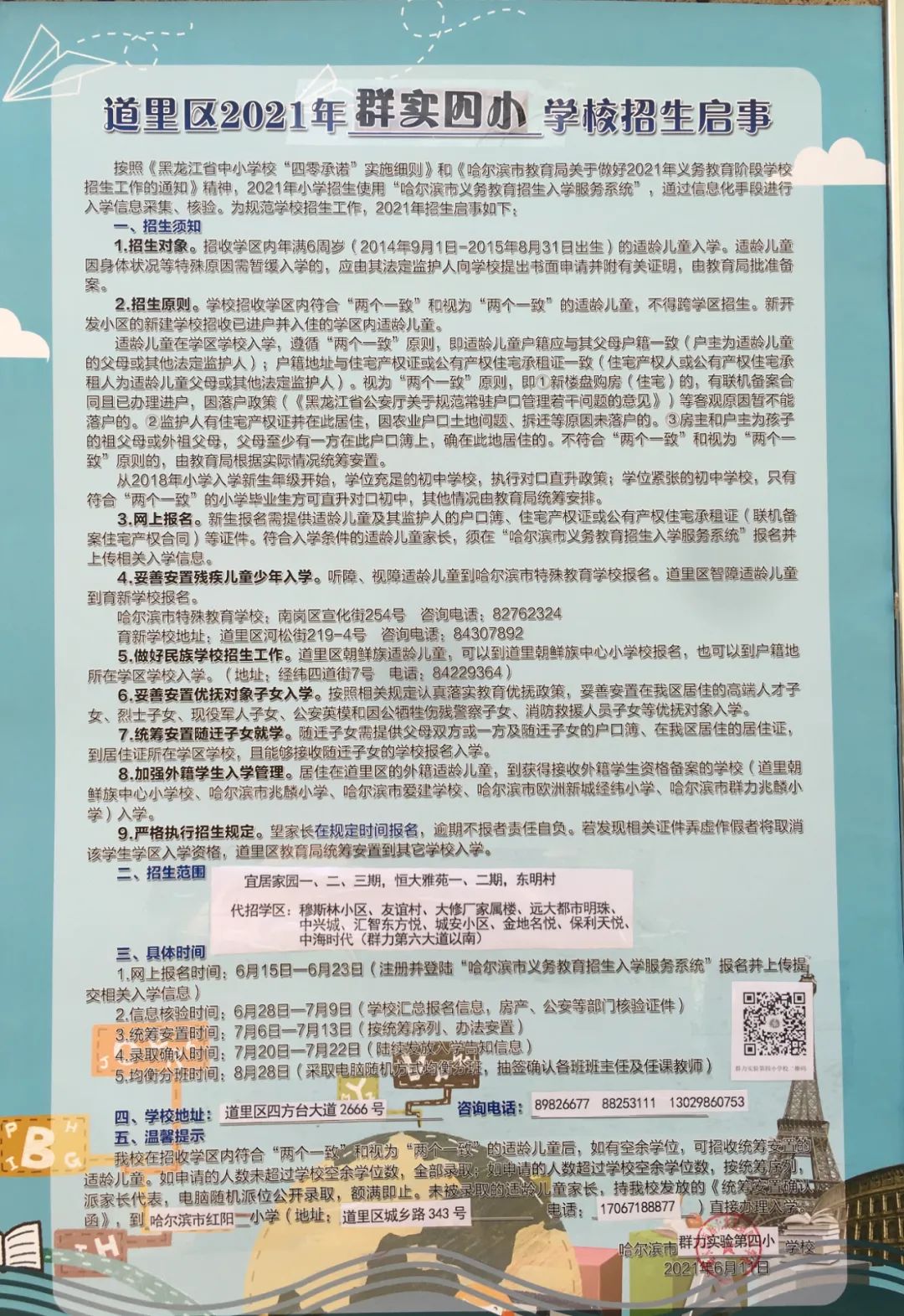 2021年哈尔滨市群力实验第四小学校招生公告,含招生咨询电话