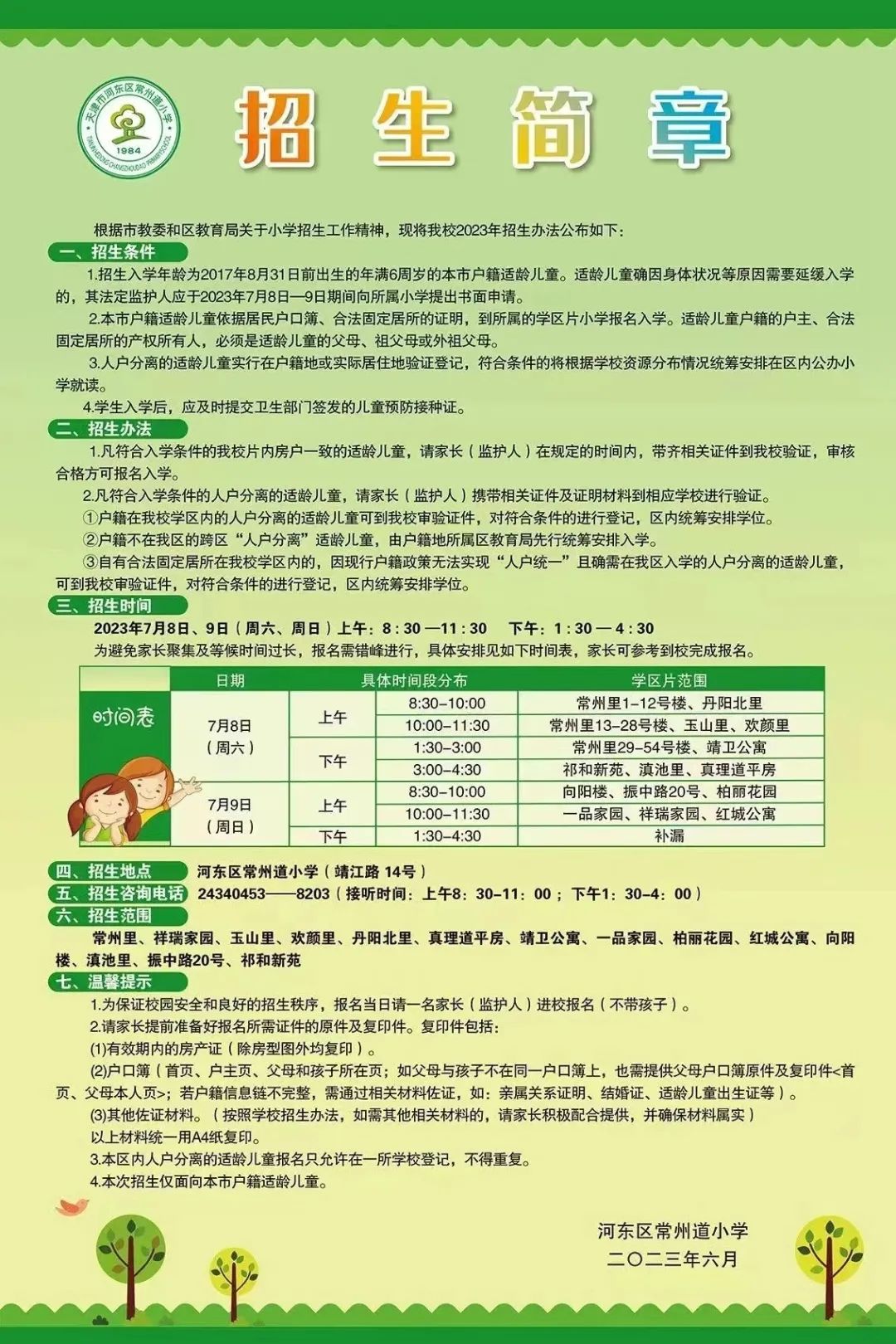 2023年天津市河东区常州道小学招生简章,含招生咨询电话