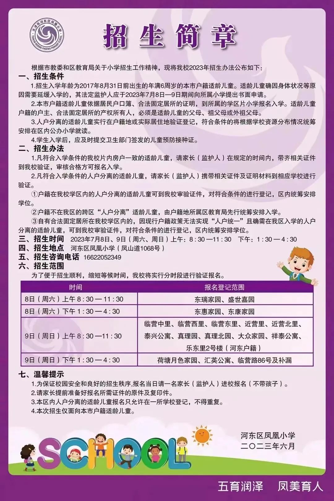 2023年天津市河东区凤凰小学招生简章,含招生咨询电话
