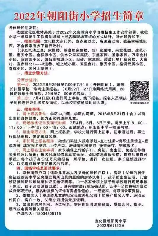 2022年张家口市宣化区朝阳街小学一年级招生简章,含招生学区范围施教区范围划分