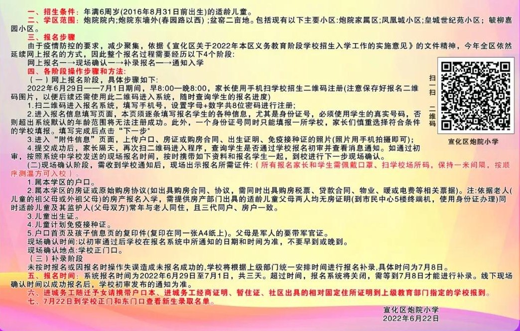 2022年张家口市宣化区炮院小学一年级招生简章,含学区范围划分