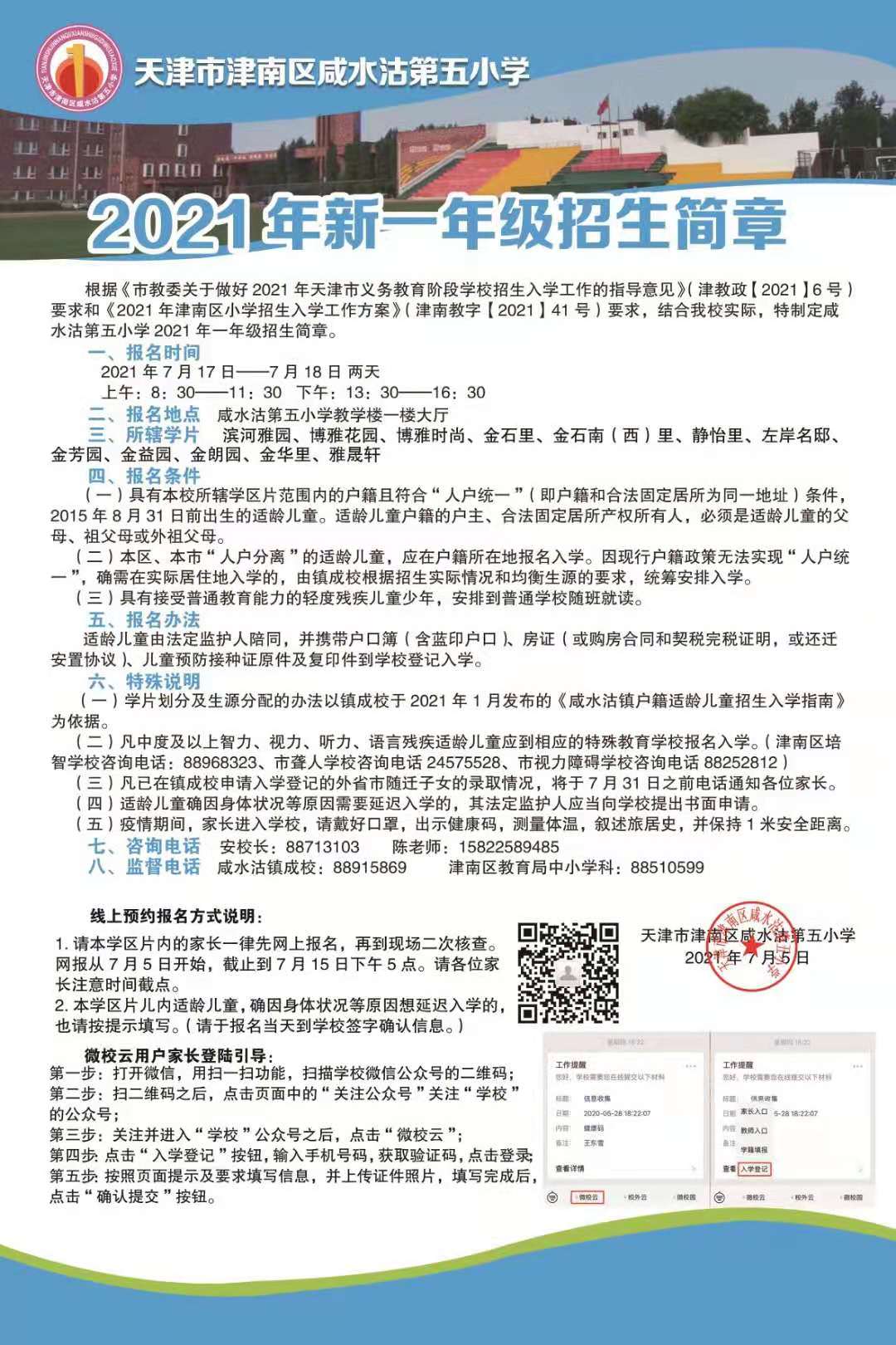 2021年天津市津南区咸水沽第五小学新生一年级招生简章,含招生咨询电话和学区范围划分