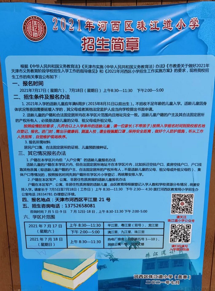 2021年天津市河西区珠江道小学招生简章,含招生咨询电话和学区范围划分
