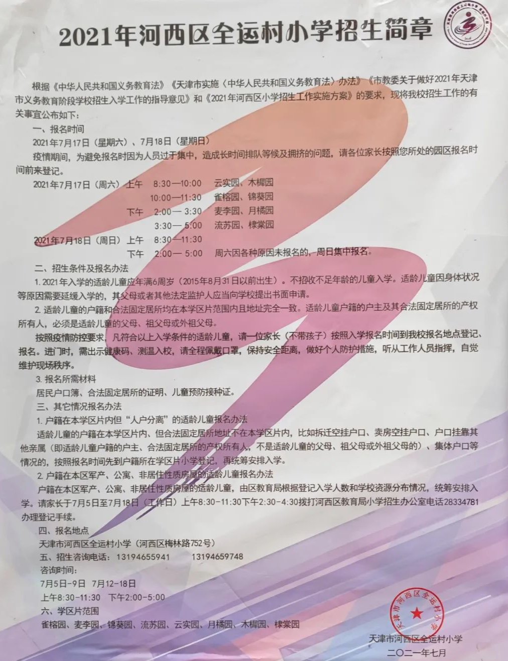 2021年天津市河西区全运村小学招生简章,含招生咨询电话和学区范围划分