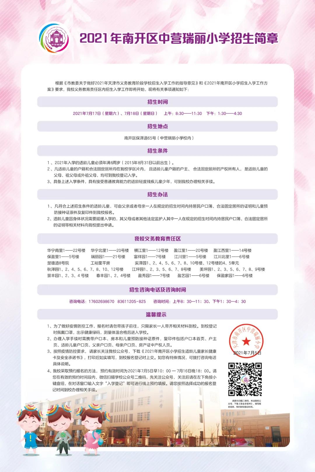 2021年天津市南开区中营瑞丽小学招生简章,含招生咨询电话和学区范围划分