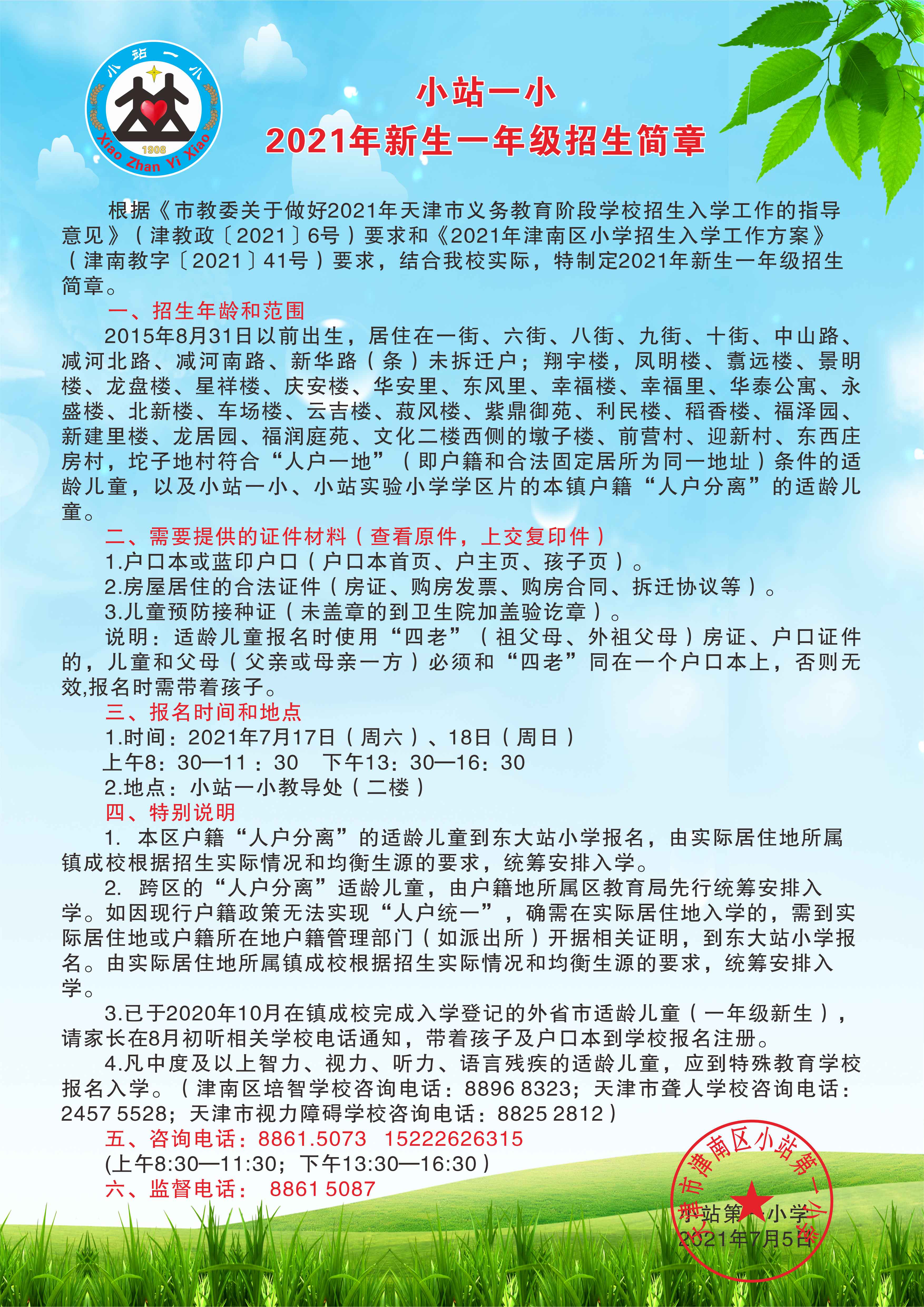 2021年天津市津南区小站第一小学小站一小新生一年级招生简章,含招生咨询电话和学区范围划分